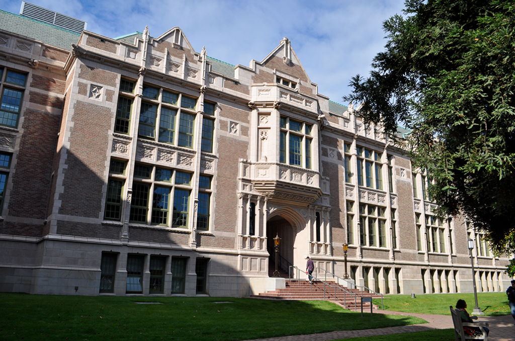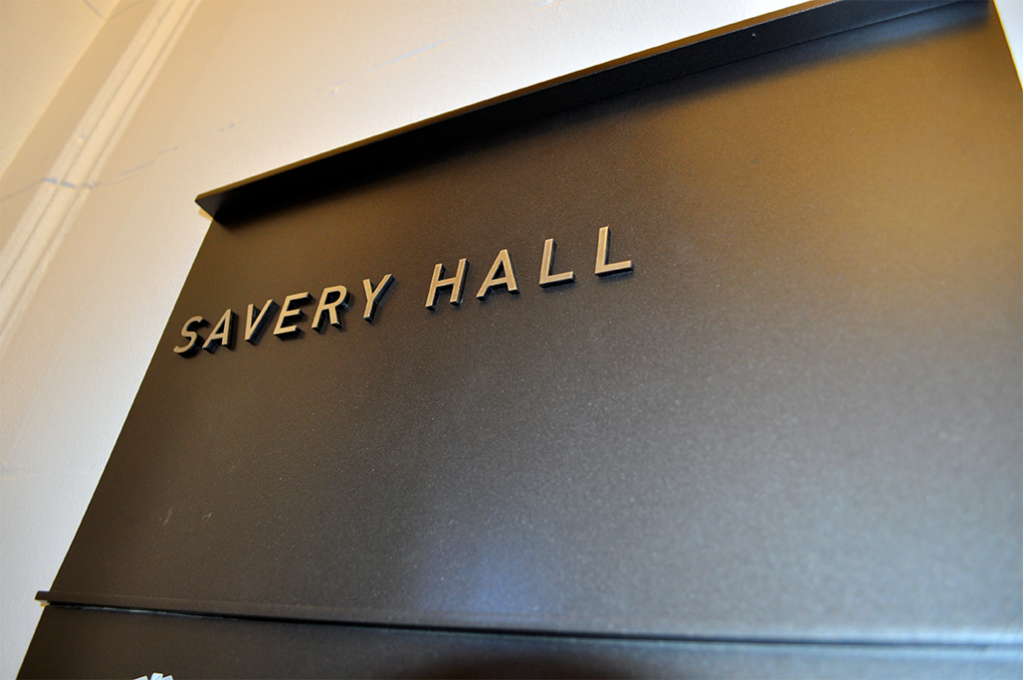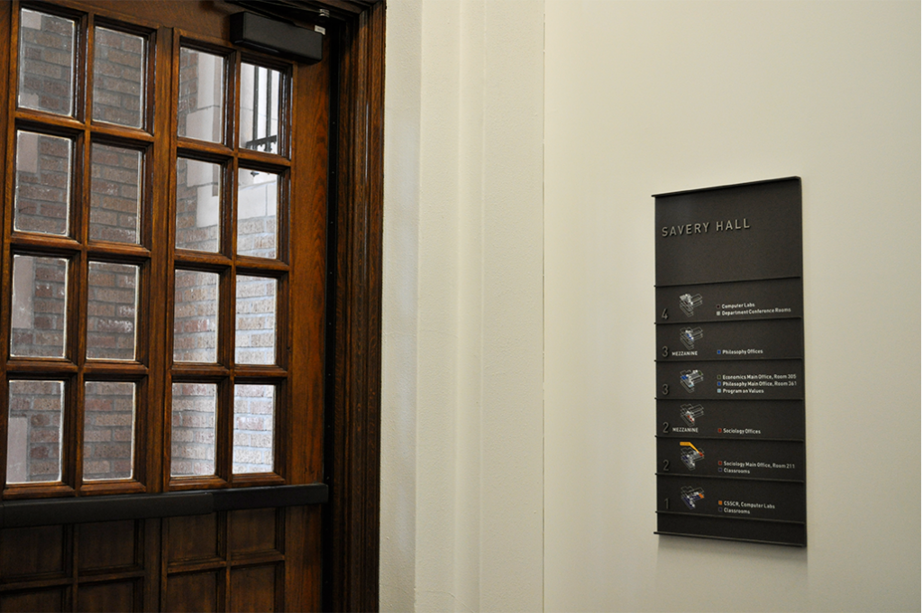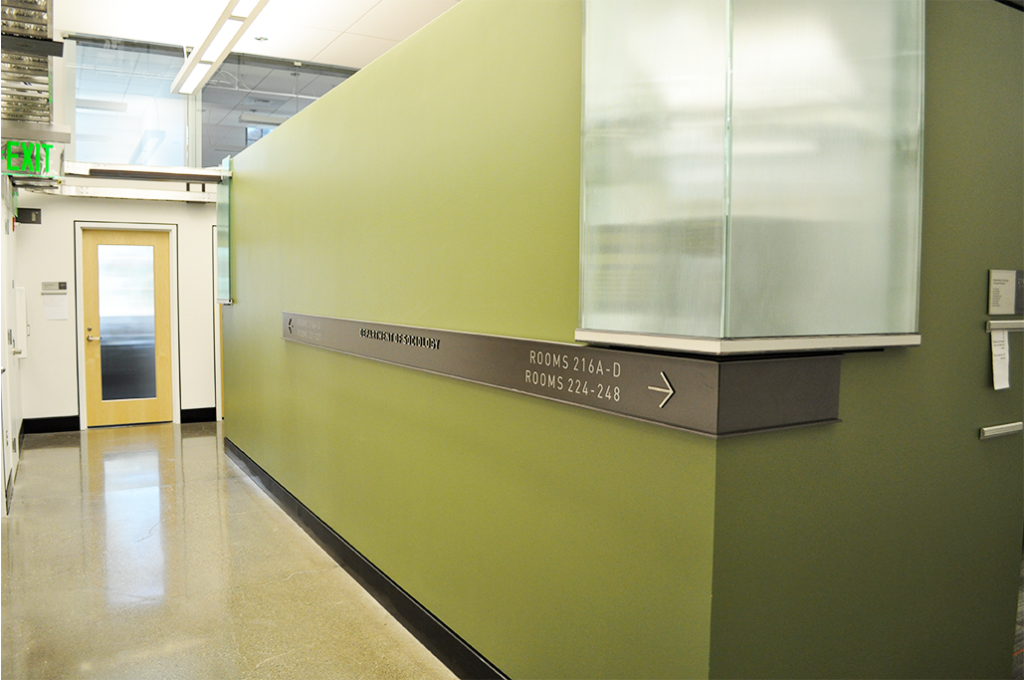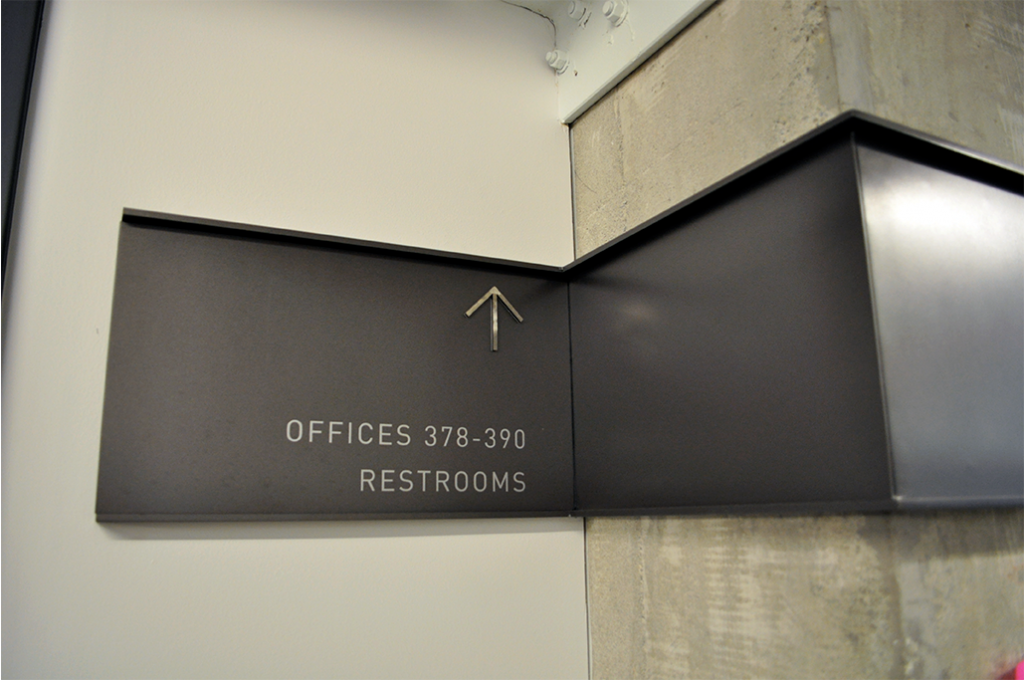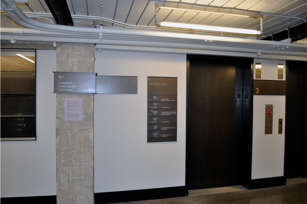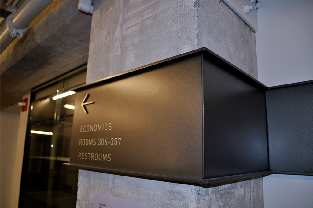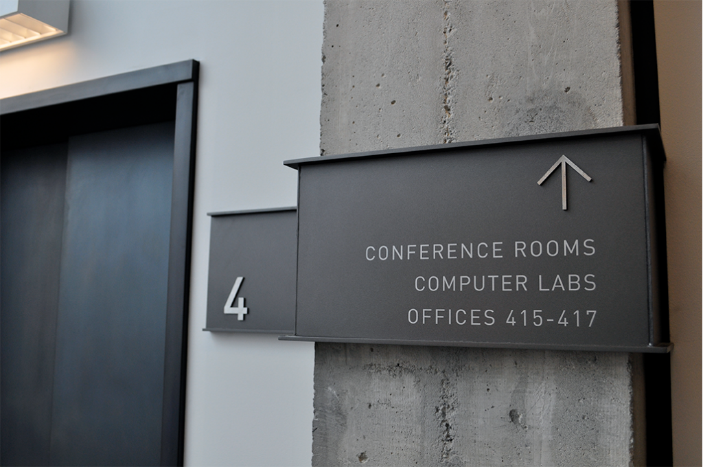 Signage and wayfinding development for a renovated historic building on a large university campus.