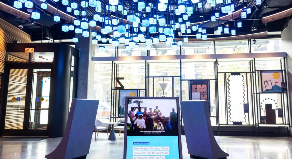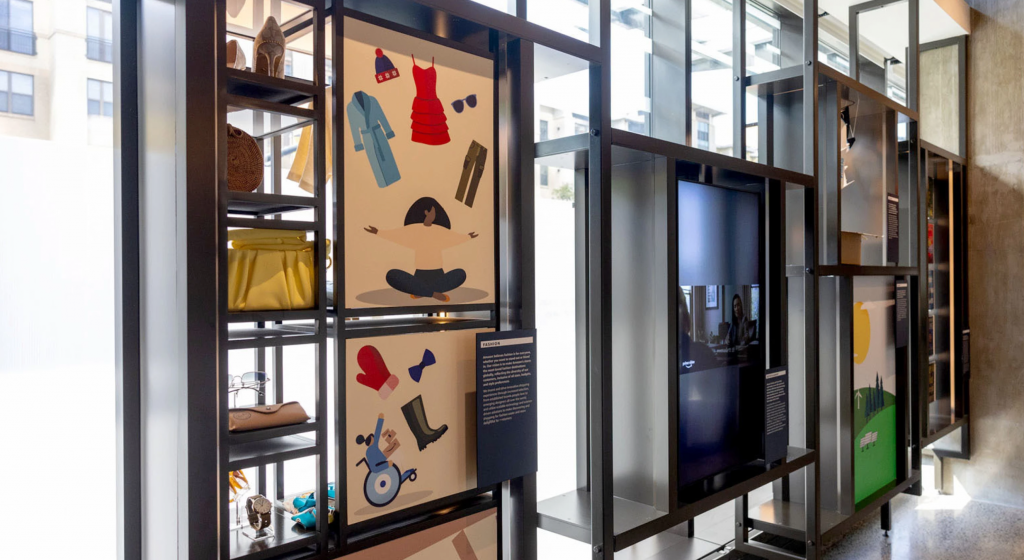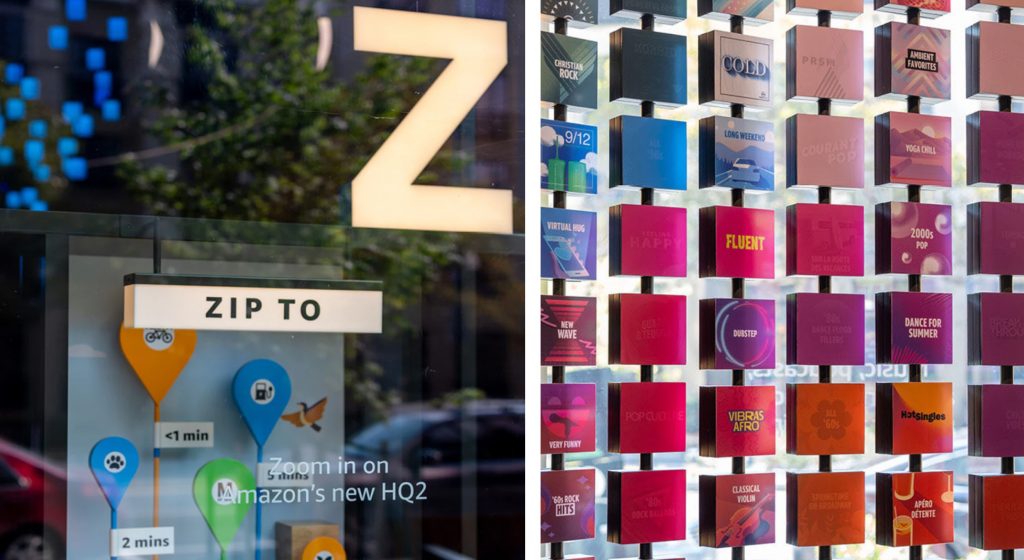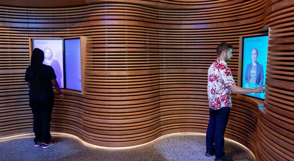 Virginia based corporate hospitality center for innovation focused storytelling encompassing biophilic design elements, interactive digital media, integrated brand graphics, and physical fixture design.