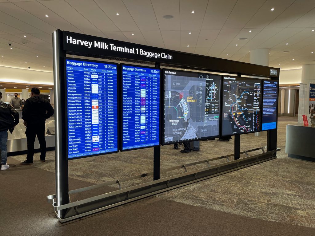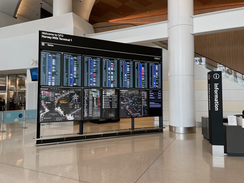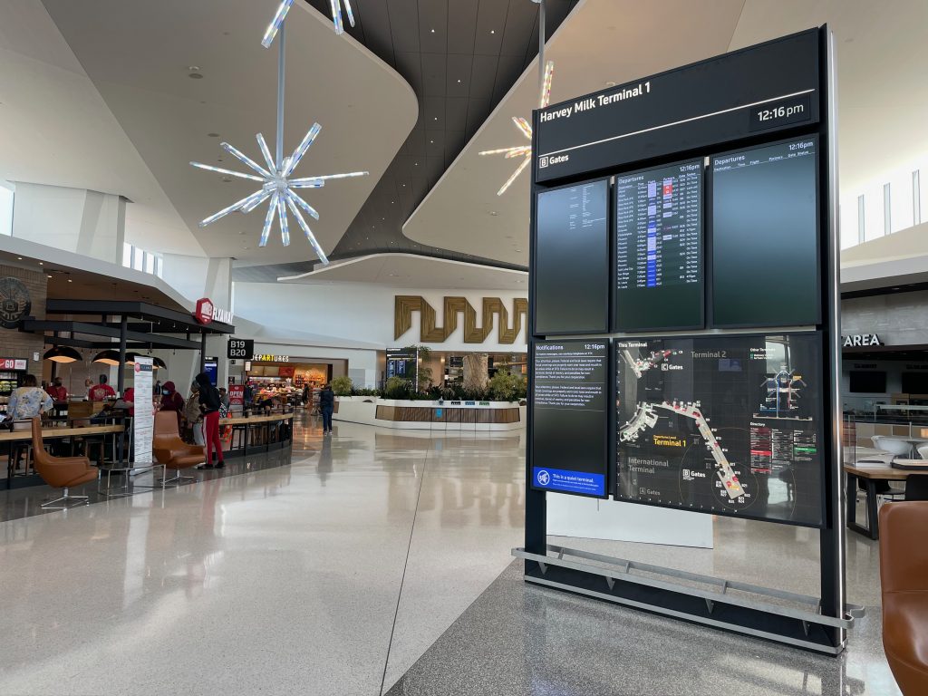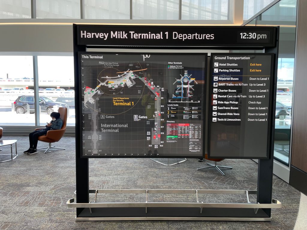Bay Area airport holistic wayfinding and information design masterplan incorporating all aspects of passenger experience, public interfaces, physical placemaking and digital media.